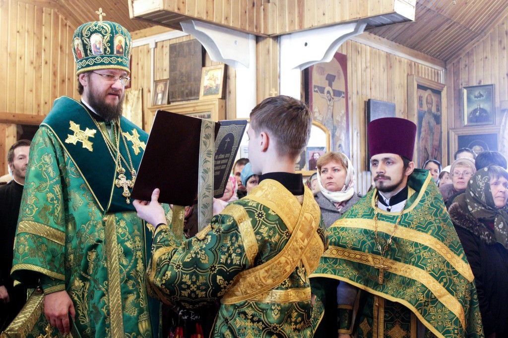 Ему сослужили: иерей Геннадий Титов, благочинный Сегежского района, протоиерей Сергий Потябин, настоятель Входоиерусалимского храма п. Надвоицы, протодиакон Сергий Олюнин.
